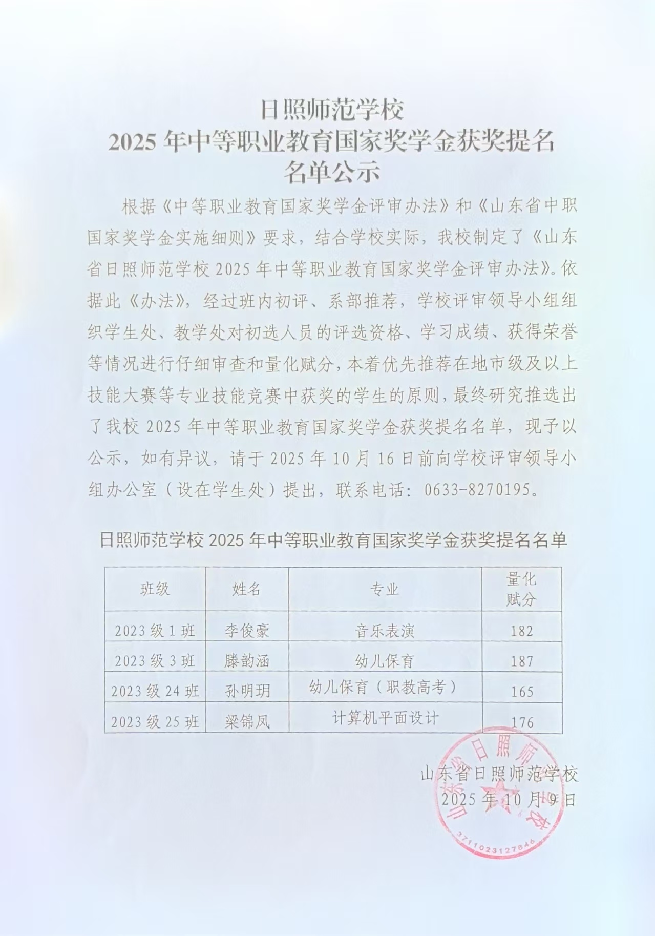 日照师范学校2025年中等职业教育国家奖学金提名名单公示